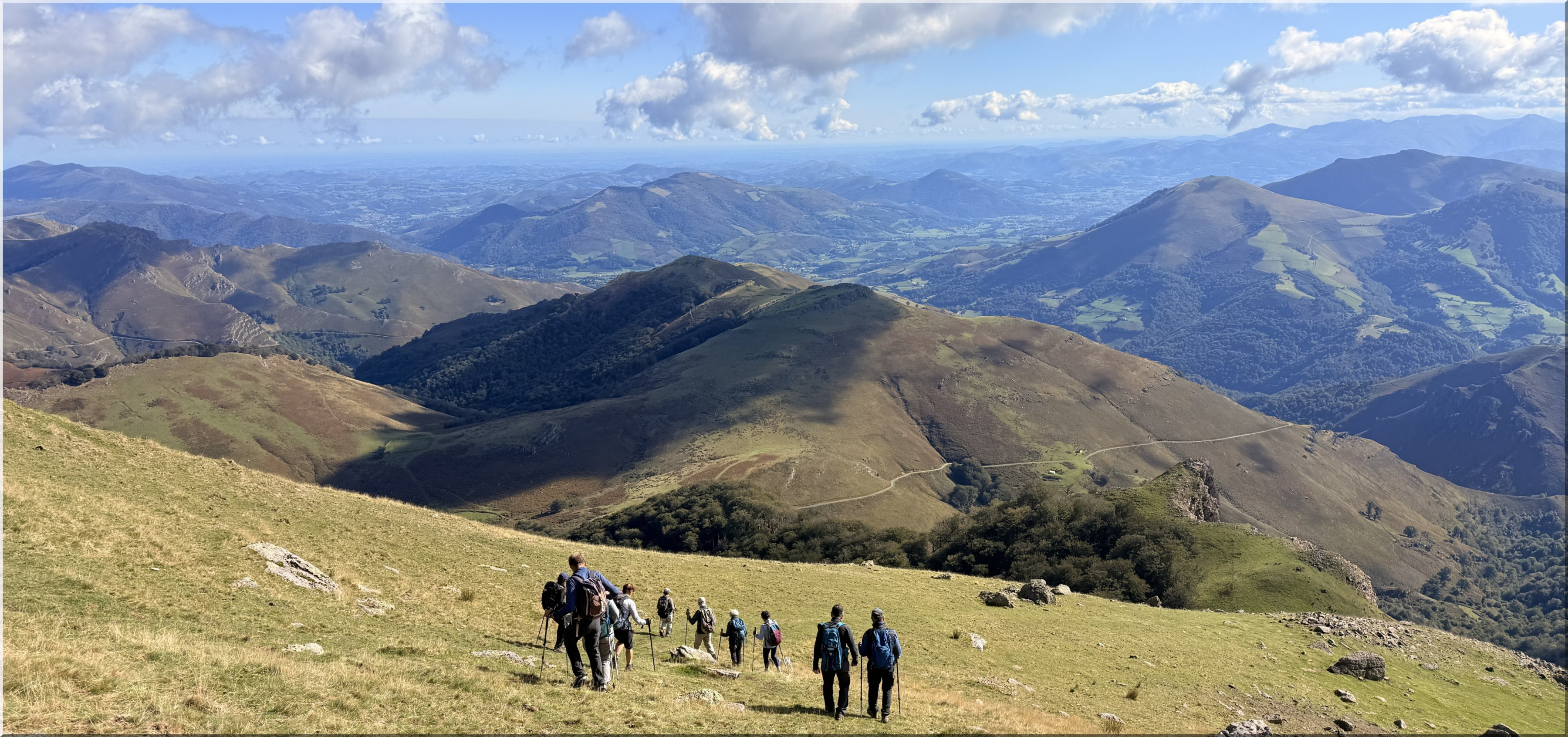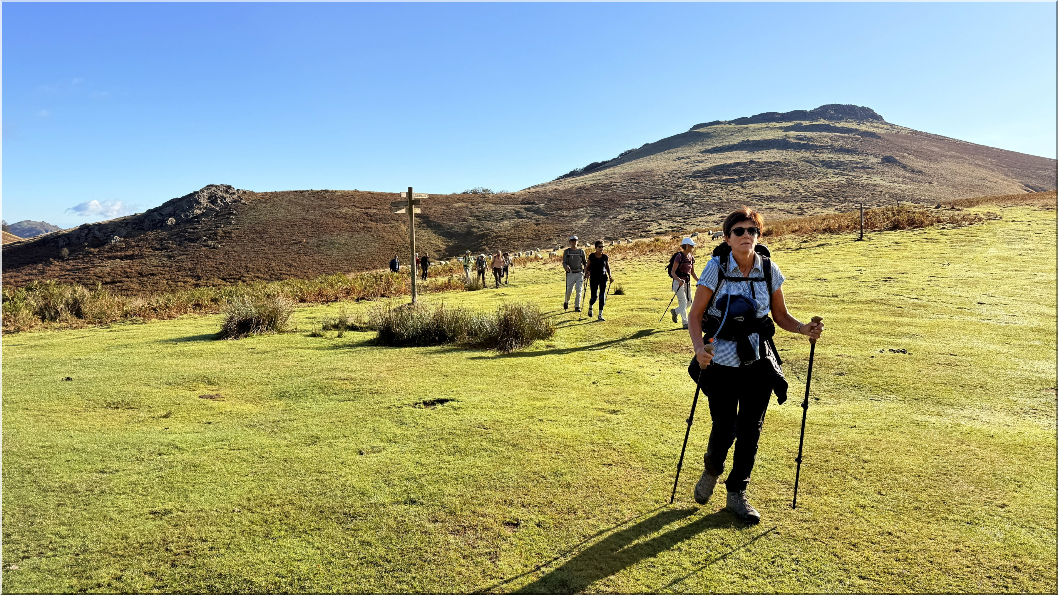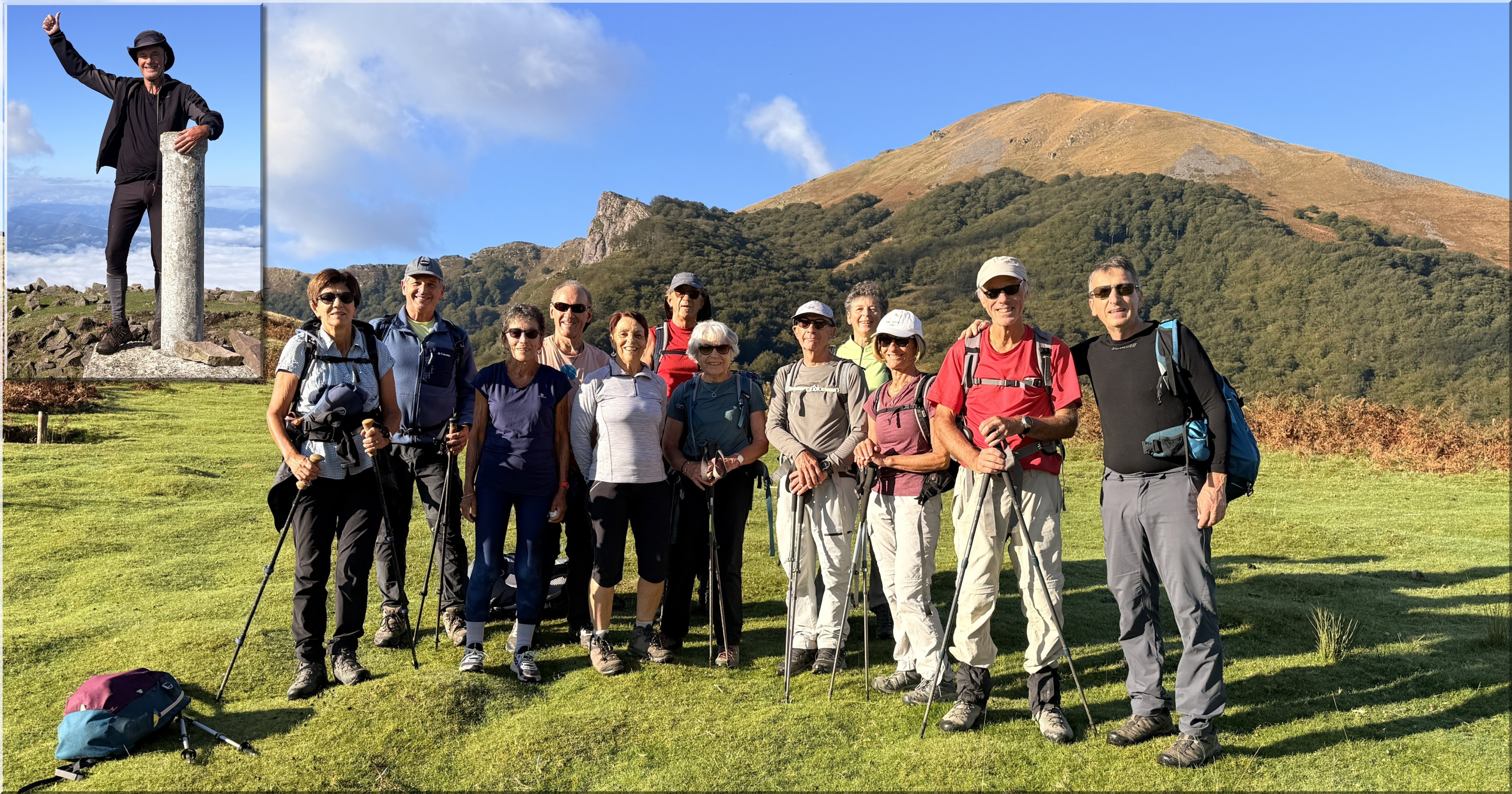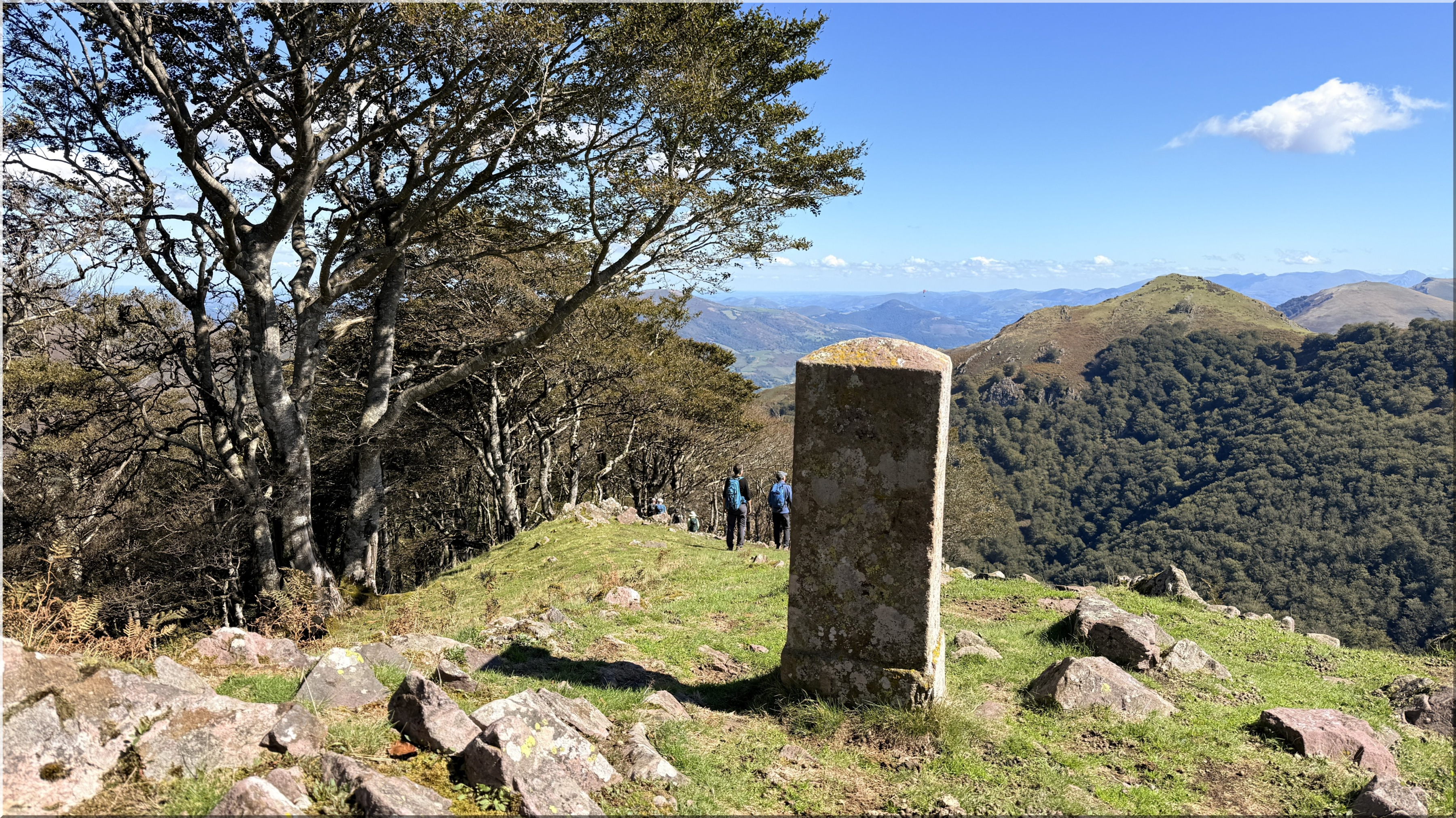 Description de la randonnée : départ d'Anglet à 7h30, démarrage de la rando à 8h45 depuis le parking du col d'Ispegui (672m). Un magnifique lever de soleil baigne la vallée de Baigorri en contrebas. On descend quelques mètres à l'est puis on se dirige vers le sud dans la forêt versant français. Passage du col de Nekaitz (814m, 9h35), nous prenons le chemin à gauche qui va vers le col d'Elhorrieta (832m, borne frontière 102). Nous gravissons ensuite la crête vers le SW en suivant des sentes balisées à la lisière de la forêt et débouchons au piton de l'Harrigorri (10h35). Après une pause, nous prenons à gauche pour atteindre la crête de l'Antsola et suivre la sente de mieux en mieux marquée au fil des années et des passages, profitant ainsi d'une montée relativement progressive. Ascension de l'Autza et arrivée au sommet (1305m) à 11h10. Vue immense et cet émerveillement toujours renouvelé devant ces paysages pourtant familiers, qui paraît lorsque le regard veut bien se poser et s'attarder sur ce qui nous entoure... Nous restons ainsi un court moment en mode contemplation sur le dôme sommital où souffle un petit vent de Nord. Descente par l'itinéraire de l'aller jusqu'au col d'Elhorrieta, nous faisons un crochet pour pique-niquer devant Elorietta Borda (12h15 à 12h45), agréablement installés au soleil. Nous reprenons notre marche, après être repassés au col de Nekaitz, nous montons plein nord et faisons un crochet sur la crête à gauche sous la conduite de Nicole. Elle nous fait chercher d'abord la croix frontière n° 96, puis nous grimpons l'Aldaburu (927m, tout proche de la B.F n° 97). Nous gravissons un peu plus loin le petit sommet rocheux de l'Olhate (ou Olate selon les cartes, 936m). Nous revenons sur le chemin qui emprunte la ligne de crêtes longeant la frontière et effectuons un nouvel arrêt sur l'Usatxarreta (861m, croix frontière n° 94). Sous un ciel limpide nous pouvons profiter de la vue à 360° sur les vallées du Baztan et de Baigorri, l'imposant Autza, le col de Meaca et les Crêtes d'Iparla notamment. Arrivée au parking à 14h25. Partage du verre (offert par le couple Parent) sur la terrasse de la Venta d'Ispegui.