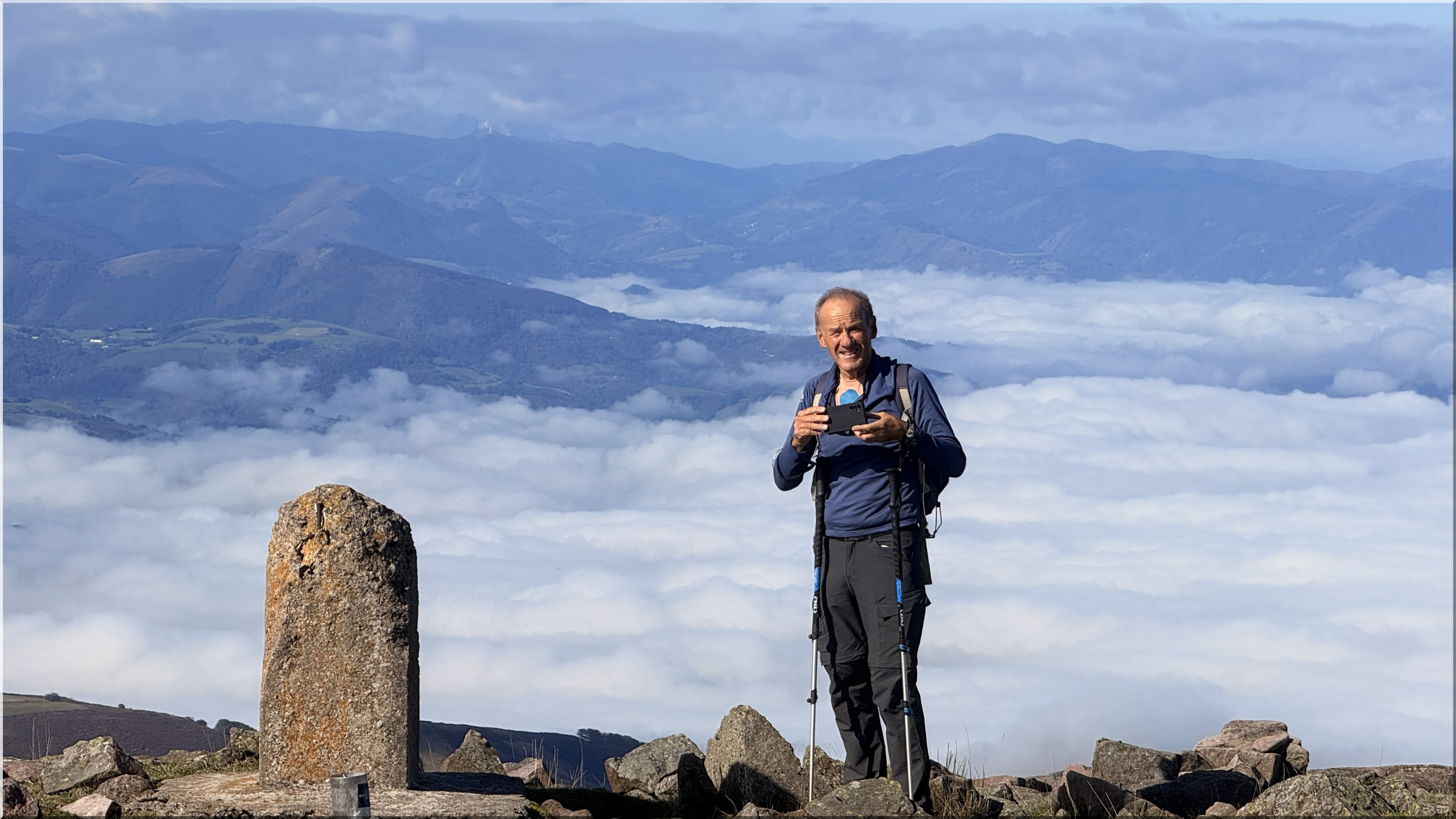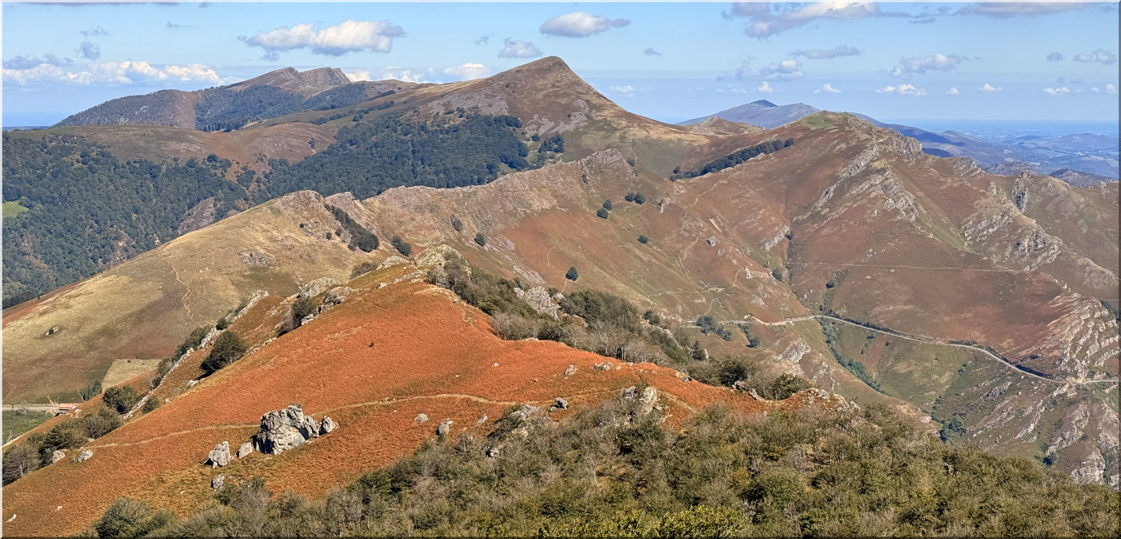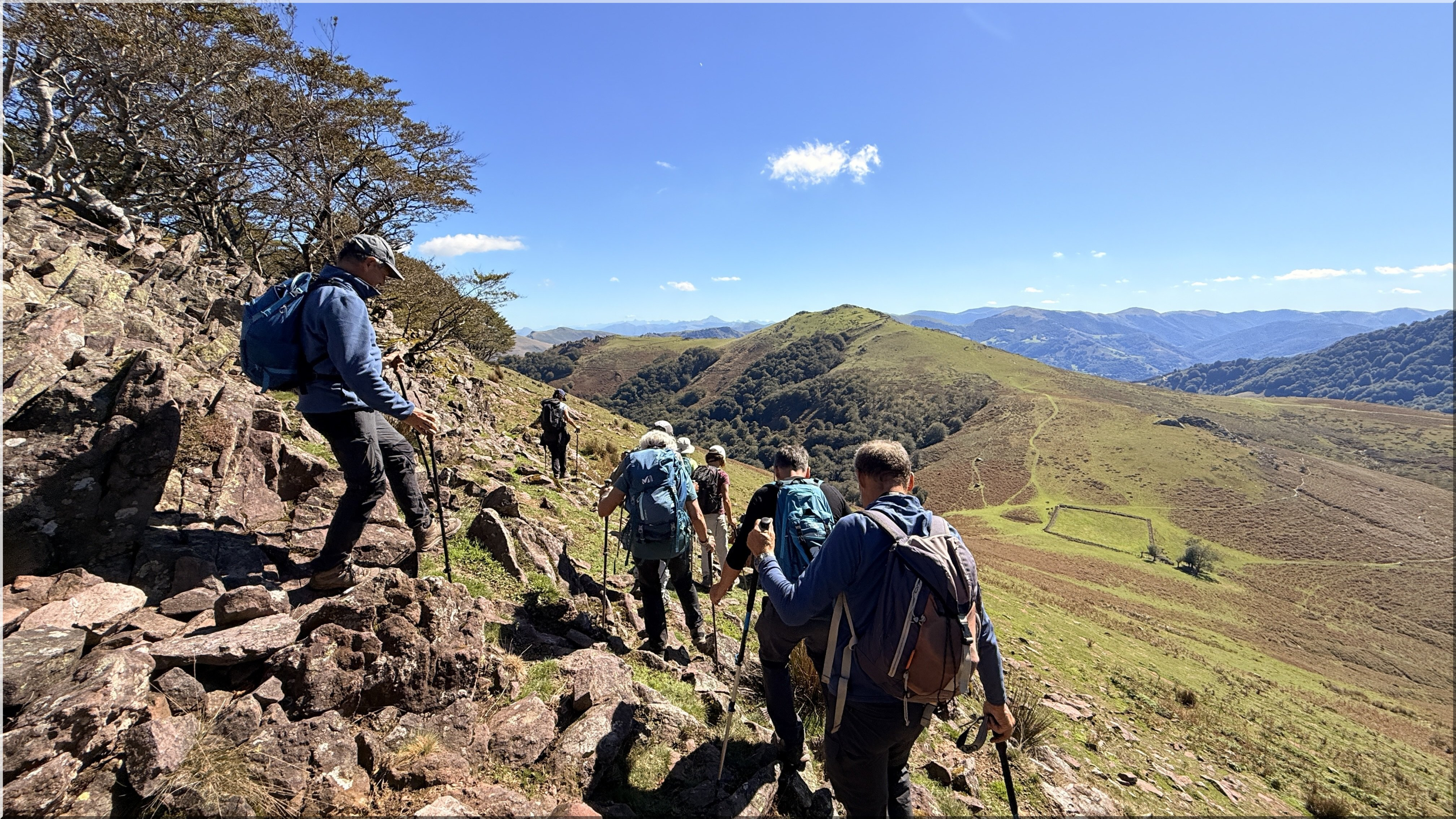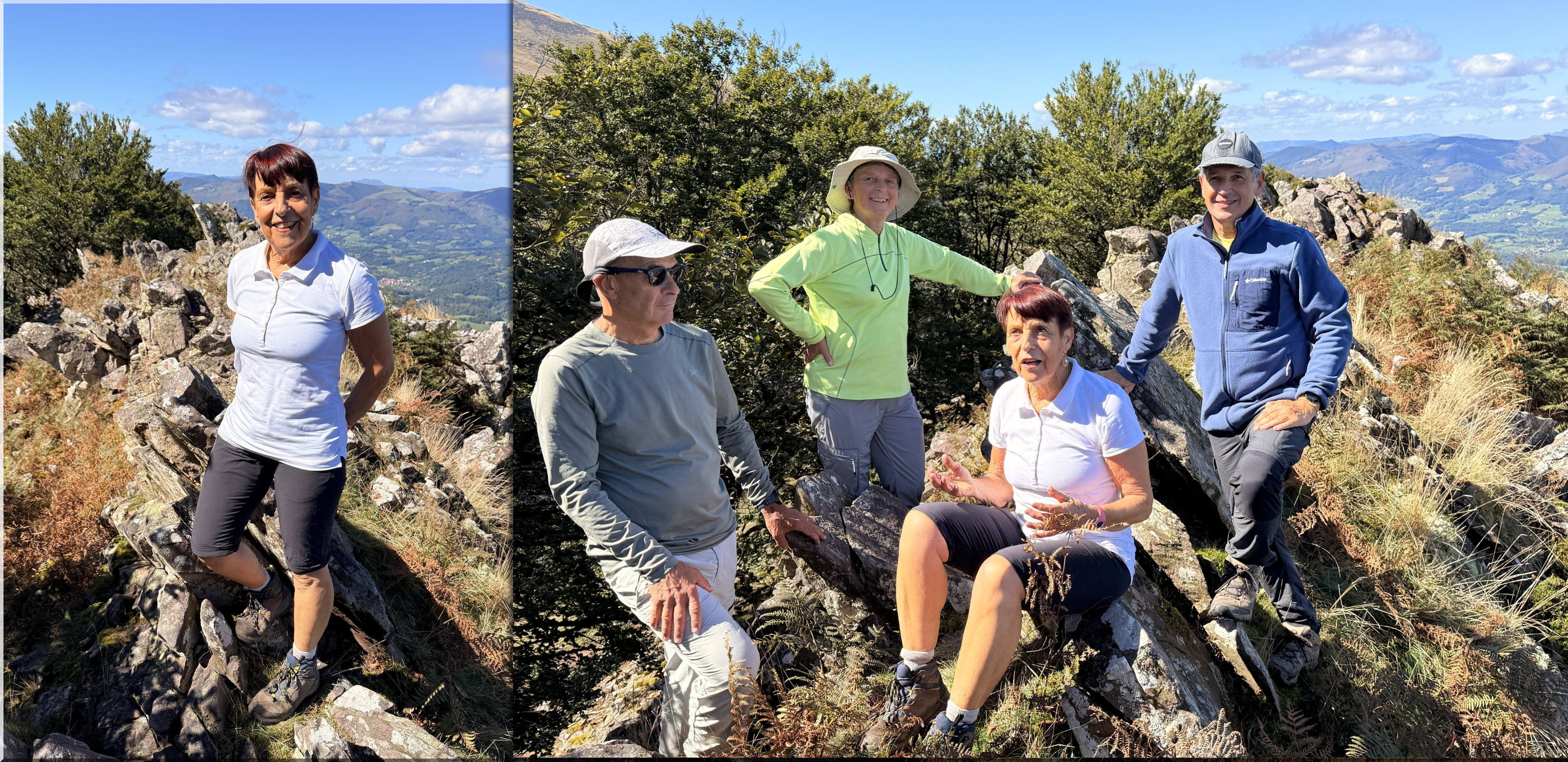 Description de la randonnée : départ d'Anglet à 7h30, démarrage de la rando à 8h45 depuis le parking du col d'Ispegui (672m). Un magnifique lever de soleil baigne la vallée de Baigorri en contrebas. On descend quelques mètres à l'est puis on se dirige vers le sud dans la forêt versant français. Passage du col de Nekaitz (814m, 9h35), nous prenons le chemin à gauche qui va vers le col d'Elhorrieta (832m, borne frontière 102). Nous gravissons ensuite la crête vers le SW en suivant des sentes balisées à la lisière de la forêt et débouchons au piton de l'Harrigorri (10h35). Après une pause, nous prenons à gauche pour atteindre la crête de l'Antsola et suivre la sente de mieux en mieux marquée au fil des années et des passages, profitant ainsi d'une montée relativement progressive. Ascension de l'Autza et arrivée au sommet (1305m) à 11h10. Vue immense et cet émerveillement toujours renouvelé devant ces paysages pourtant familiers, qui paraît lorsque le regard veut bien se poser et s'attarder sur ce qui nous entoure... Nous restons ainsi un court moment en mode contemplation sur le dôme sommital où souffle un petit vent de Nord. Descente par l'itinéraire de l'aller jusqu'au col d'Elhorrieta, nous faisons un crochet pour pique-niquer devant Elorietta Borda (12h15 à 12h45), agréablement installés au soleil. Nous reprenons notre marche, après être repassés au col de Nekaitz, nous montons plein nord et faisons un crochet sur la crête à gauche sous la conduite de Nicole. Elle nous fait chercher d'abord la croix frontière n° 96, puis nous grimpons l'Aldaburu (927m, tout proche de la B.F n° 97). Nous gravissons un peu plus loin le petit sommet rocheux de l'Olhate (ou Olate selon les cartes, 936m). Nous revenons sur le chemin qui emprunte la ligne de crêtes longeant la frontière et effectuons un nouvel arrêt sur l'Usatxarreta (861m, croix frontière n° 94). Sous un ciel limpide nous pouvons profiter de la vue à 360° sur les vallées du Baztan et de Baigorri, l'imposant Autza, le col de Meaca et les Crêtes d'Iparla notamment. Arrivée au parking à 14h25. Partage du verre (offert par le couple Parent) sur la terrasse de la Venta d'Ispegui.