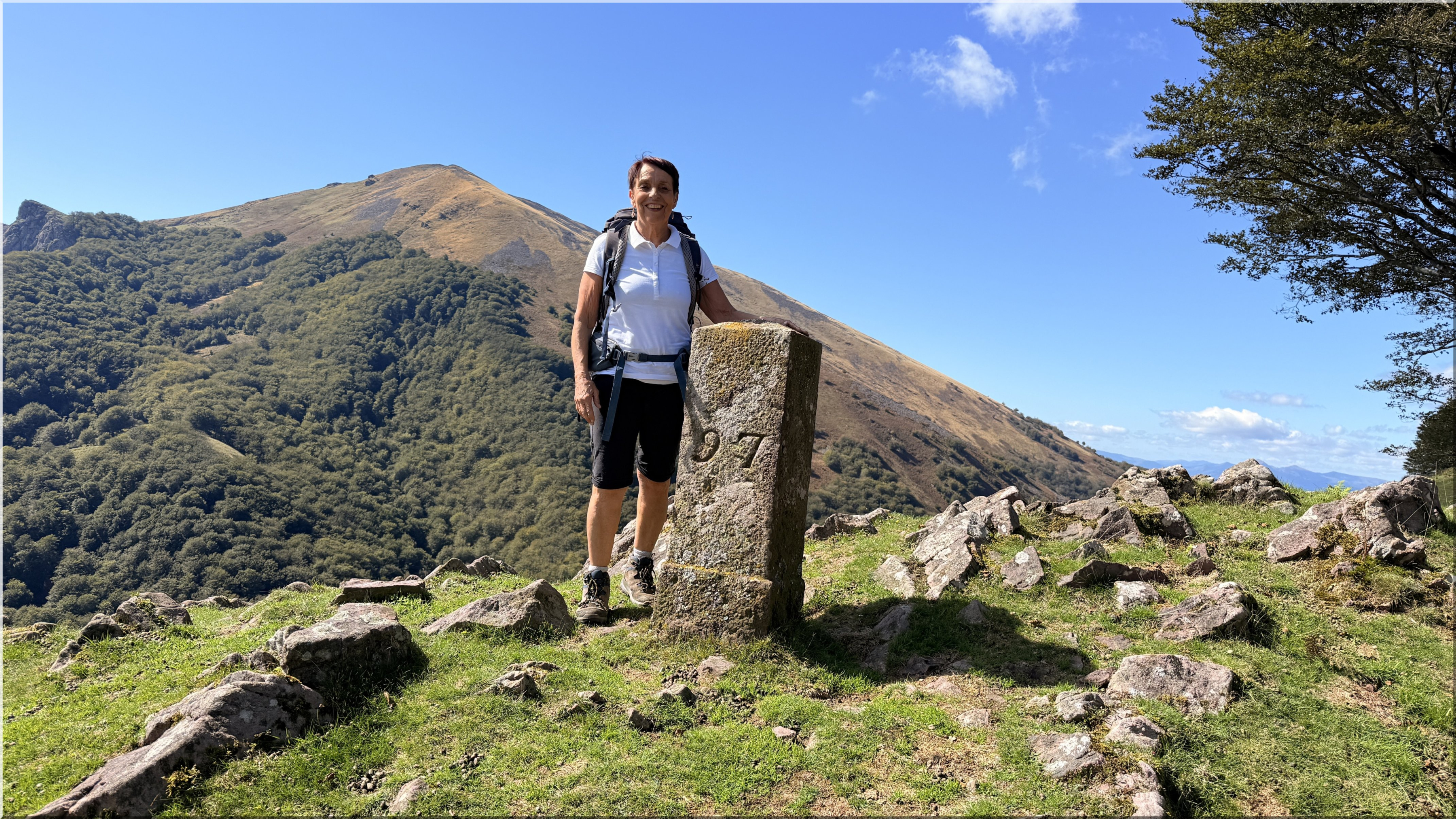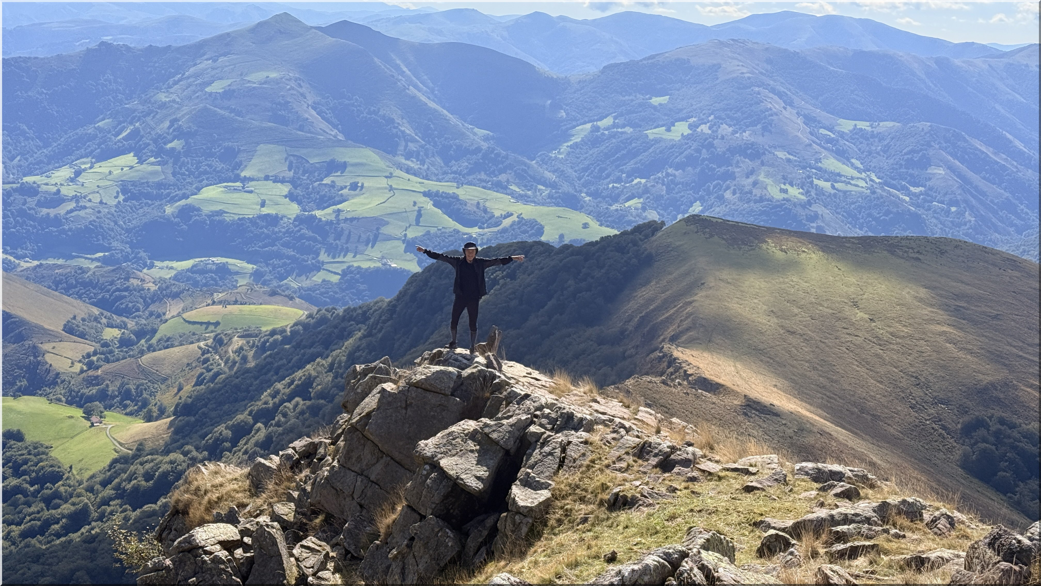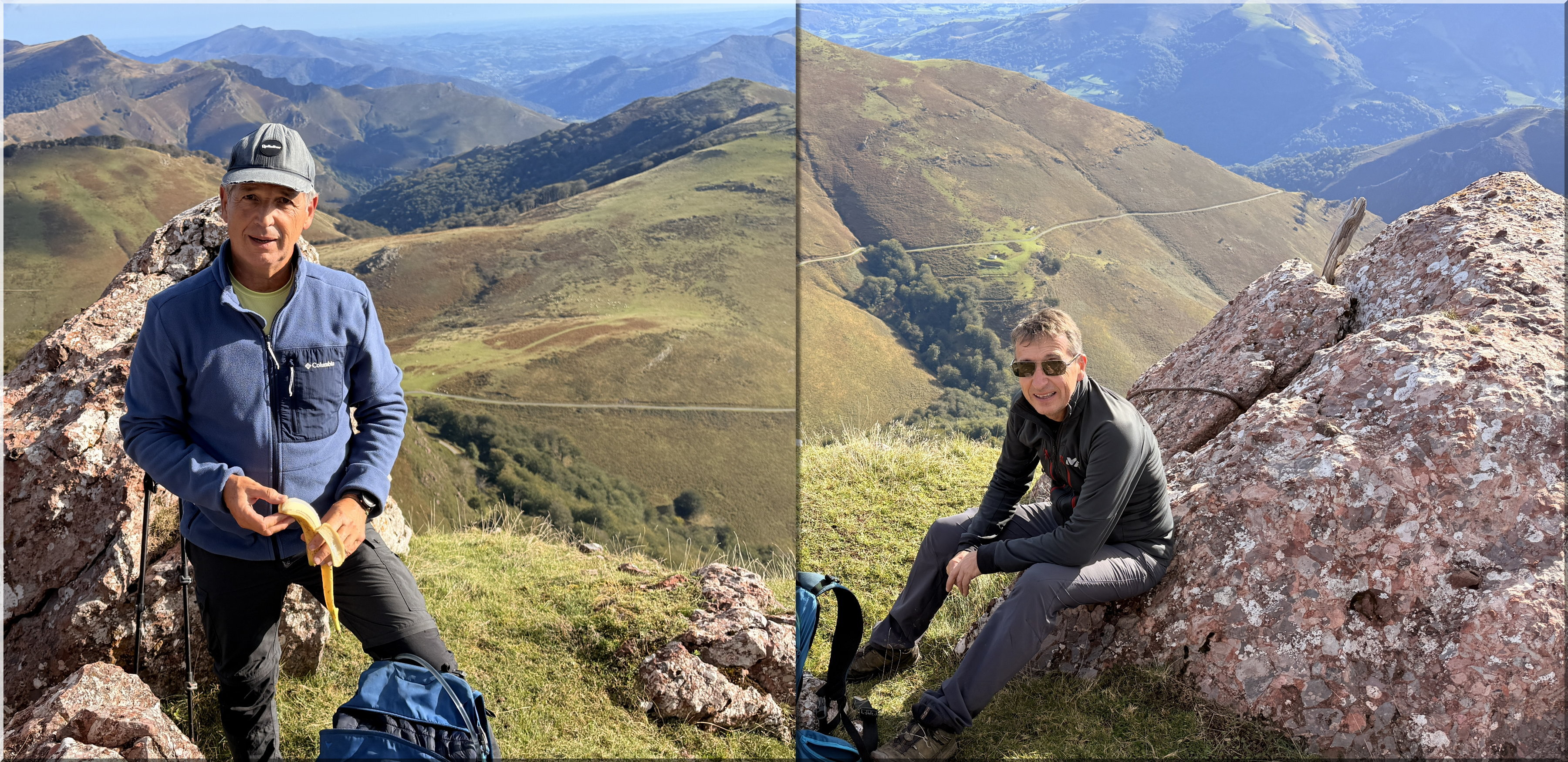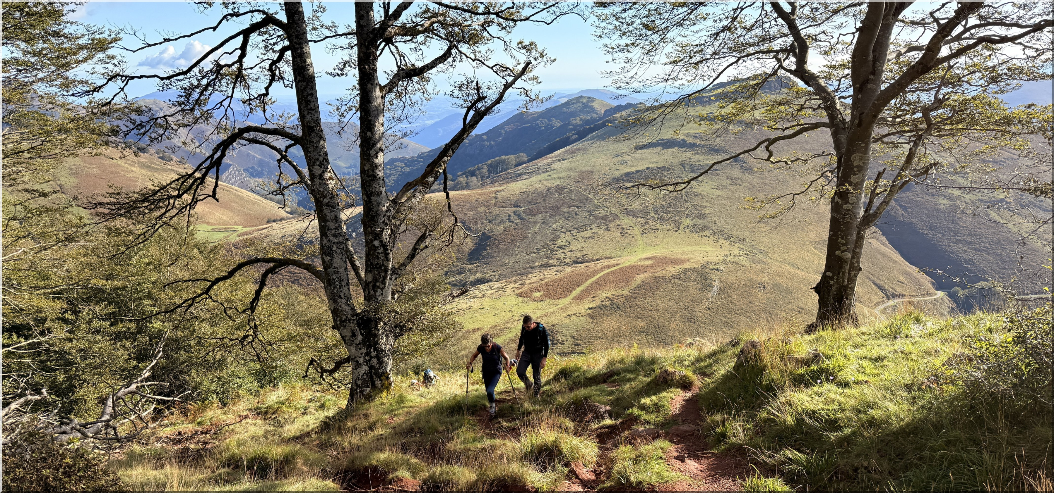 Description de la randonnée : départ d'Anglet à 7h30, démarrage de la rando à 8h45 depuis le parking du col d'Ispegui (672m). Un magnifique lever de soleil baigne la vallée de Baigorri en contrebas. On descend quelques mètres à l'est puis on se dirige vers le sud dans la forêt versant français. Passage du col de Nekaitz (814m, 9h35), nous prenons le chemin à gauche qui va vers le col d'Elhorrieta (832m, borne frontière 102). Nous gravissons ensuite la crête vers le SW en suivant des sentes balisées à la lisière de la forêt et débouchons au piton de l'Harrigorri (10h35). Après une pause, nous prenons à gauche pour atteindre la crête de l'Antsola et suivre la sente de mieux en mieux marquée au fil des années et des passages, profitant ainsi d'une montée relativement progressive. Ascension de l'Autza et arrivée au sommet (1305m) à 11h10. Vue immense et cet émerveillement toujours renouvelé devant ces paysages pourtant familiers, qui paraît lorsque le regard veut bien se poser et s'attarder sur ce qui nous entoure... Nous restons ainsi un court moment en mode contemplation sur le dôme sommital où souffle un petit vent de Nord. Descente par l'itinéraire de l'aller jusqu'au col d'Elhorrieta, nous faisons un crochet pour pique-niquer devant Elorietta Borda (12h15 à 12h45), agréablement installés au soleil. Nous reprenons notre marche, après être repassés au col de Nekaitz, nous montons plein nord et faisons un crochet sur la crête à gauche sous la conduite de Nicole. Elle nous fait chercher d'abord la croix frontière n° 96, puis nous grimpons l'Aldaburu (927m, tout proche de la B.F n° 97). Nous gravissons un peu plus loin le petit sommet rocheux de l'Olhate (ou Olate selon les cartes, 936m). Nous revenons sur le chemin qui emprunte la ligne de crêtes longeant la frontière et effectuons un nouvel arrêt sur l'Usatxarreta (861m, croix frontière n° 94). Sous un ciel limpide nous pouvons profiter de la vue à 360° sur les vallées du Baztan et de Baigorri, l'imposant Autza, le col de Meaca et les Crêtes d'Iparla notamment. Arrivée au parking à 14h25. Partage du verre (offert par le couple Parent) sur la terrasse de la Venta d'Ispegui.