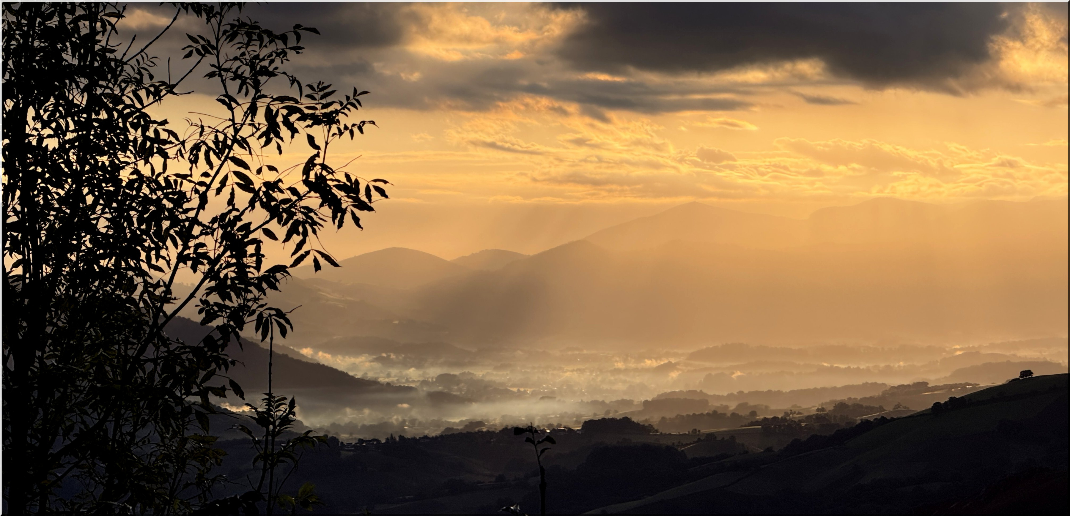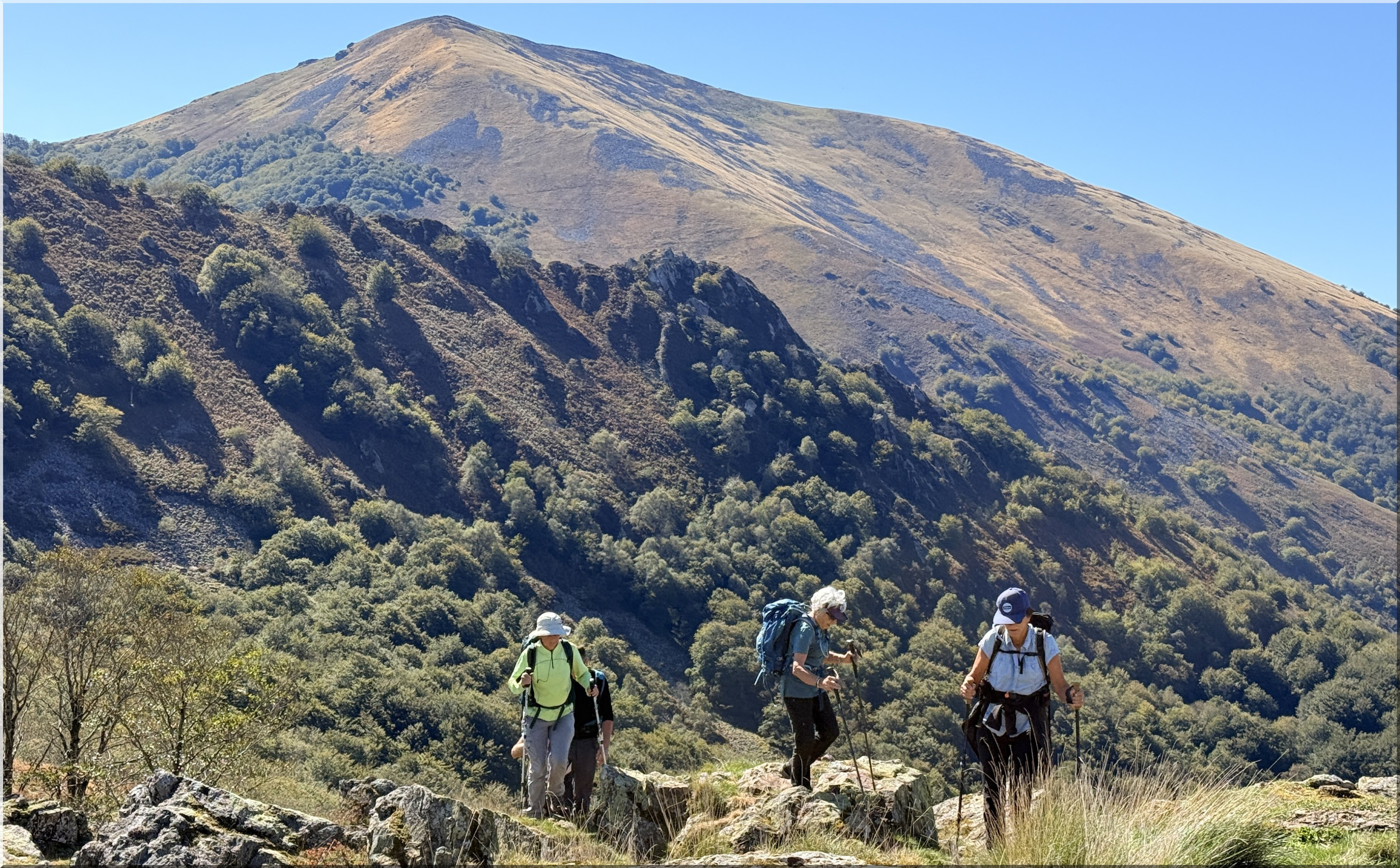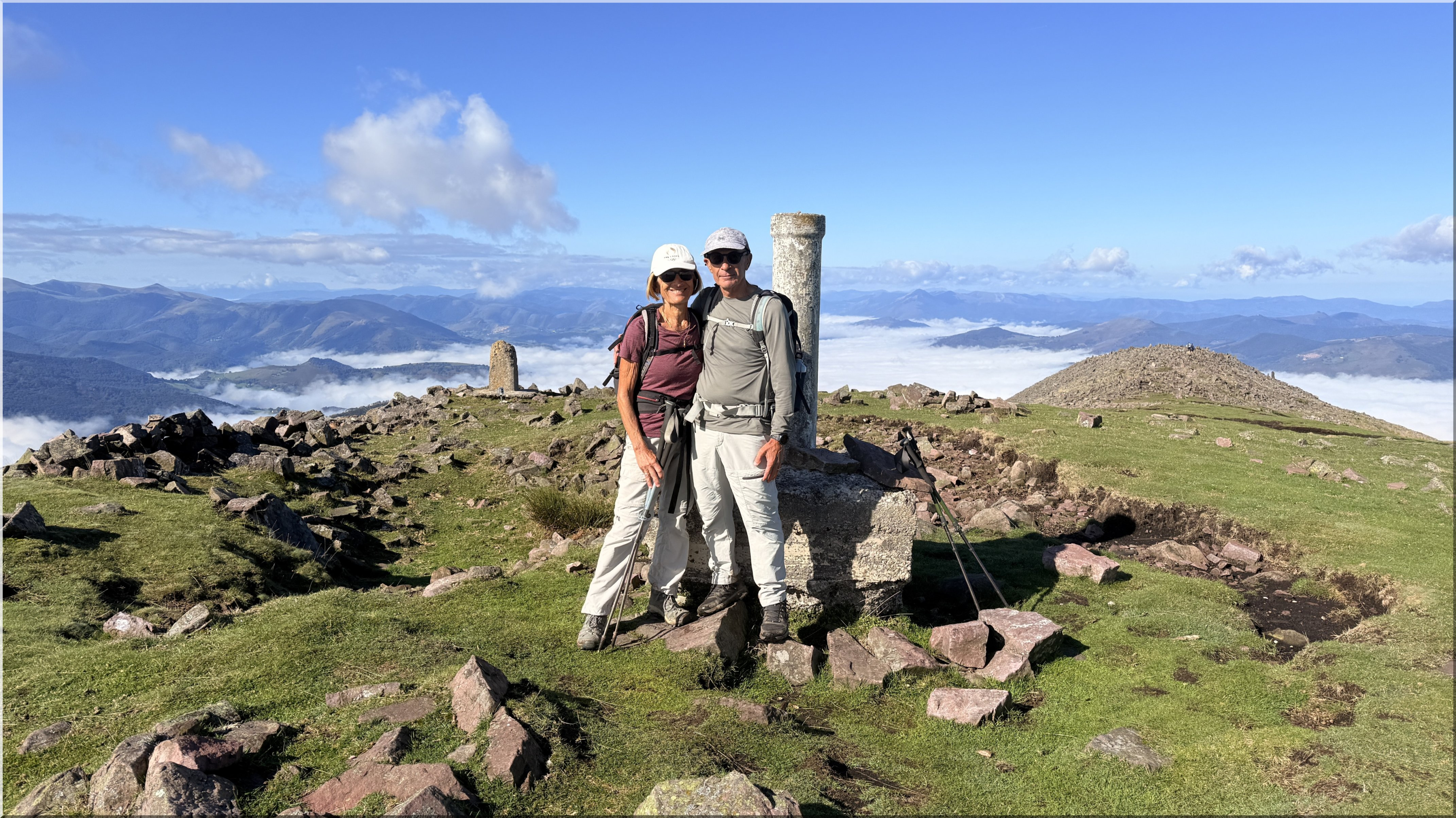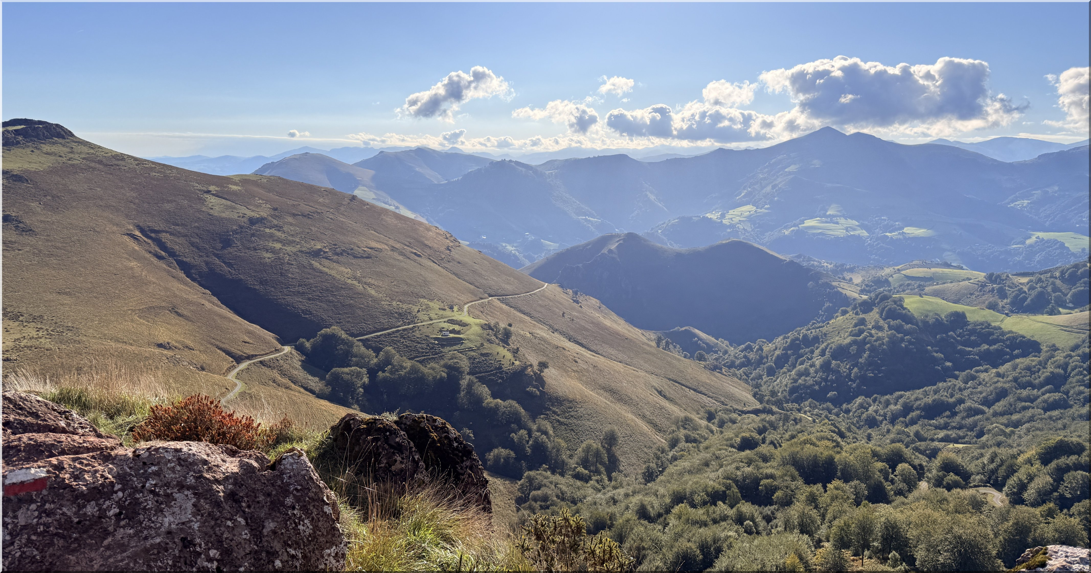 Description de la randonnée : départ d'Anglet à 7h30, démarrage de la rando à 8h45 depuis le parking du col d'Ispegui (672m). Un magnifique lever de soleil baigne la vallée de Baigorri en contrebas. On descend quelques mètres à l'est puis on se dirige vers le sud dans la forêt versant français. Passage du col de Nekaitz (814m, 9h35), nous prenons le chemin à gauche qui va vers le col d'Elhorrieta (832m, borne frontière 102). Nous gravissons ensuite la crête vers le SW en suivant des sentes balisées à la lisière de la forêt et débouchons au piton de l'Harrigorri (10h35). Après une pause, nous prenons à gauche pour atteindre la crête de l'Antsola et suivre la sente de mieux en mieux marquée au fil des années et des passages, profitant ainsi d'une montée relativement progressive. Ascension de l'Autza et arrivée au sommet (1305m) à 11h10. Vue immense et cet émerveillement toujours renouvelé devant ces paysages pourtant familiers, qui paraît lorsque le regard veut bien se poser et s'attarder sur ce qui nous entoure... Nous restons ainsi un court moment en mode contemplation sur le dôme sommital où souffle un petit vent de Nord. Descente par l'itinéraire de l'aller jusqu'au col d'Elhorrieta, nous faisons un crochet pour pique-niquer devant Elorietta Borda (12h15 à 12h45), agréablement installés au soleil. Nous reprenons notre marche, après être repassés au col de Nekaitz, nous montons plein nord et faisons un crochet sur la crête à gauche sous la conduite de Nicole. Elle nous fait chercher d'abord la croix frontière n° 96, puis nous grimpons l'Aldaburu (927m, tout proche de la B.F n° 97). Nous gravissons un peu plus loin le petit sommet rocheux de l'Olhate (ou Olate selon les cartes, 936m). Nous revenons sur le chemin qui emprunte la ligne de crêtes longeant la frontière et effectuons un nouvel arrêt sur l'Usatxarreta (861m, croix frontière n° 94). Sous un ciel limpide nous pouvons profiter de la vue à 360° sur les vallées du Baztan et de Baigorri, l'imposant Autza, le col de Meaca et les Crêtes d'Iparla notamment. Arrivée au parking à 14h25. Partage du verre (offert par le couple Parent) sur la terrasse de la Venta d'Ispegui.