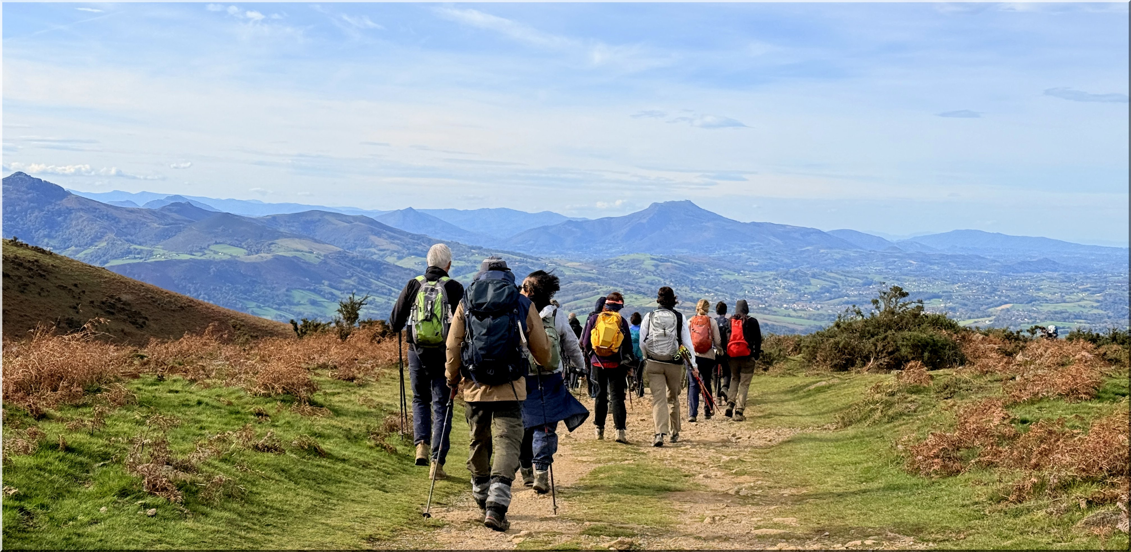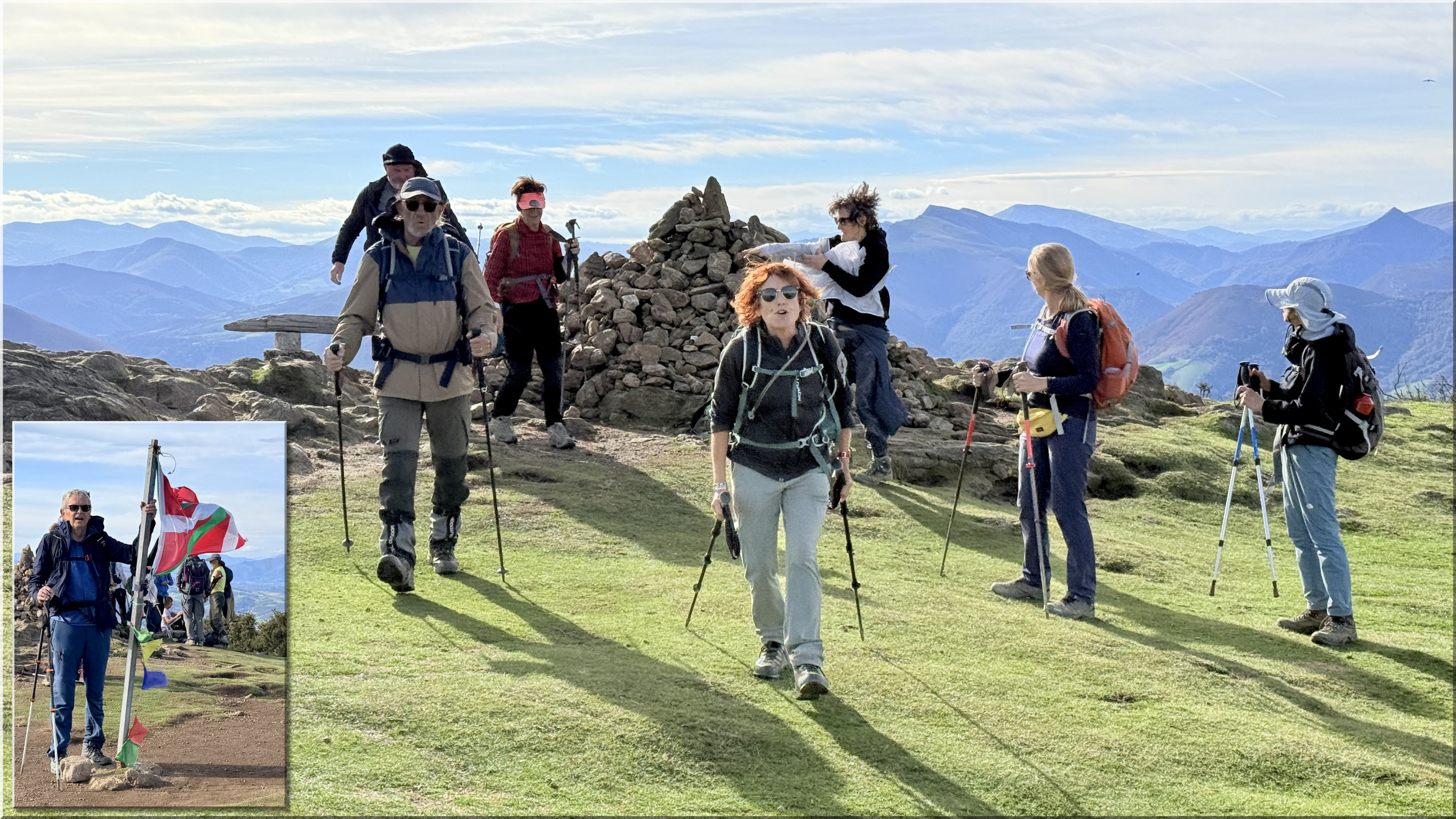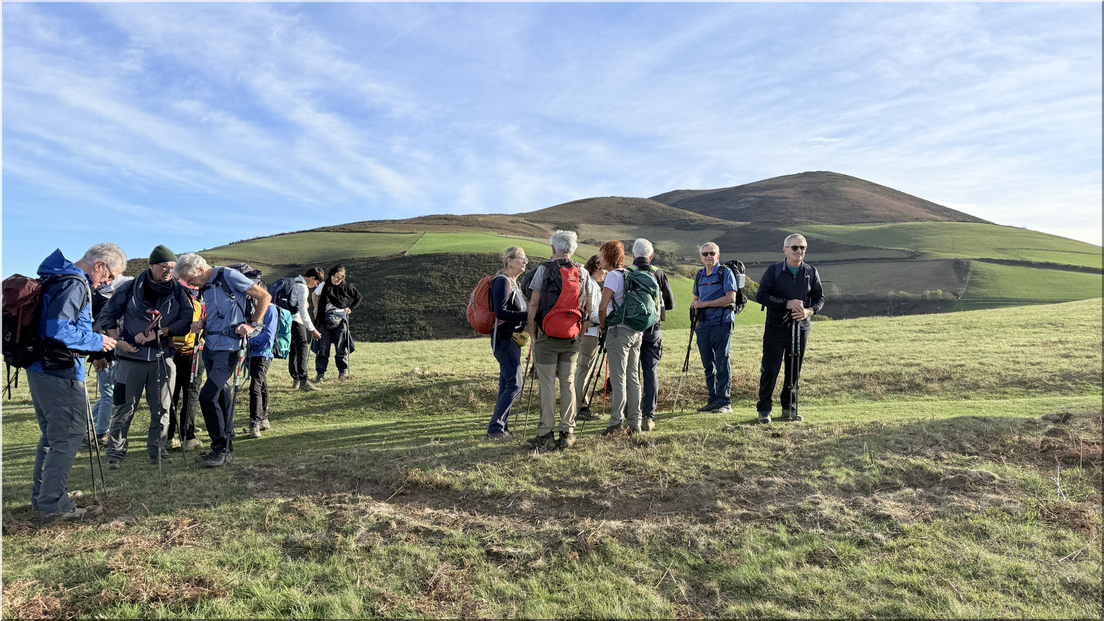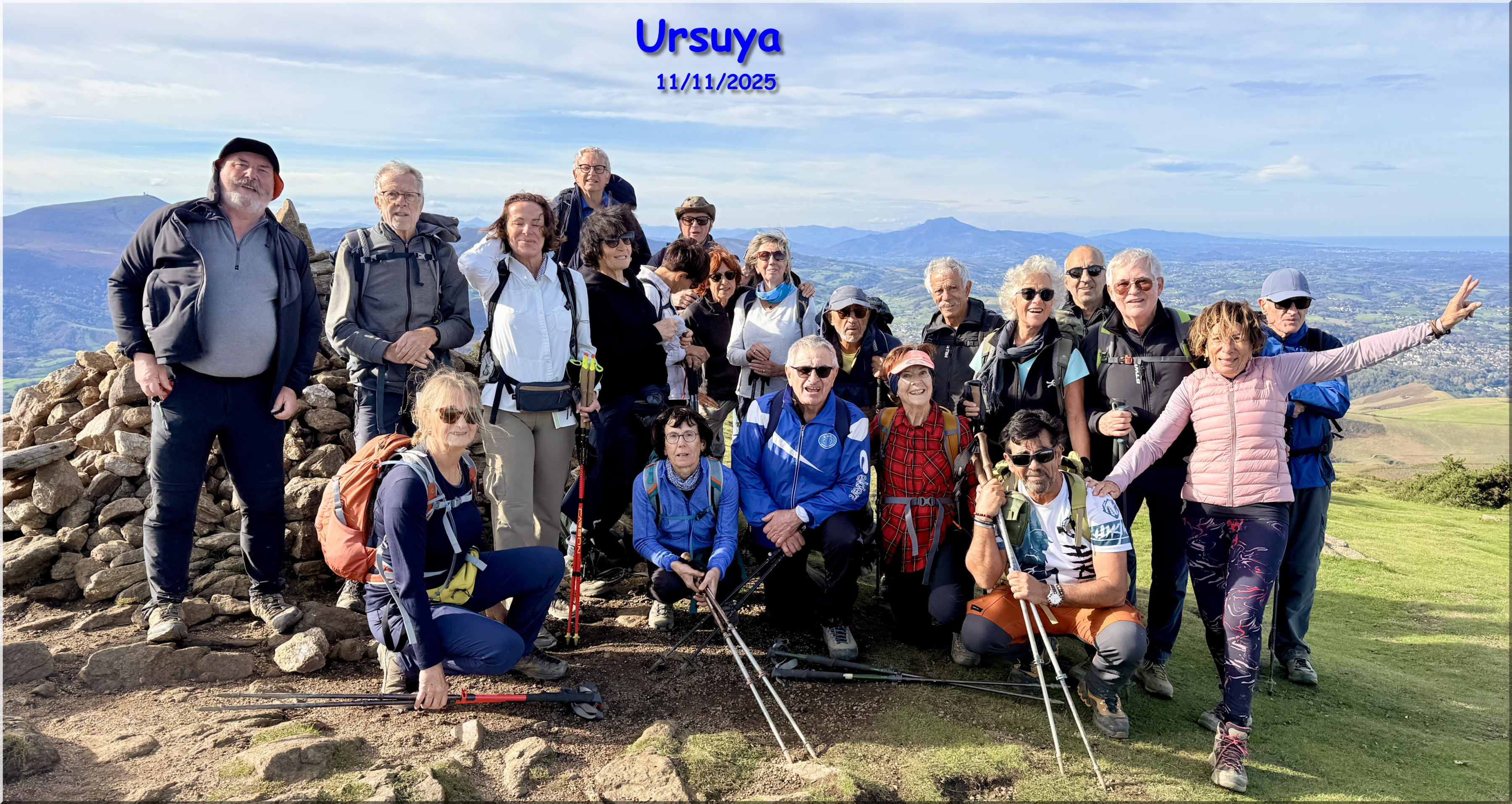 de la rando à 8h30 depuis le parking proche du fronton du village d'Urcuray (altitude 79 m). En préalable, nous saluons le grand retour de Jacques P en tant que guide. Nous suivons ensuite la route direction sud, longeons un ruisseau, passons un portillon métallique en traversant quelques sections très boueuses. Nous commençons à monter, présence de plusieurs captages d'eau, Le chemin poursuit sa pente ascendante dans la vallée et nous entrons dans la forêt. Au-dessus d'une cascade, un sentier prend le relais. La forêt s'éclaircit progressivement et nous cheminons désormais sur la crête herbeuse d'Harrixuri jusqu'au col d'Iramalda (10h05, 397m, courte pause à cet endroit). Au niveau d'une grange, nous tournons à gauche sur une large piste en terre qui monte sur le flanc Ouest de l'Ursuya. Grande douceur des températures, mais le vent du sud forcit à mesure que nous montons. Arrivée au sommet (678m) à 11h40. Le vent ne nous permet pas de pique-niquer confortablement ici, aussi nous descendons jusqu'à l'antenne relais située plus bas, davantage abrités côté nord. Pause pique-nique de 12h00 à 12h25. Nous reprenons notre descente, passons à droite d'une petite barre rocheuse à proximité d'un pylône et arrivons sur une piste jusqu'au point coté 438 (ancienne bergerie, aujourd'hui transformée en demeure habitable). Plus loin un panneau indiquant "Retour Urcuray" nous donne la marche à suivre. Sur la fin du parcours, nous suivons un itinéraire original qui s'écarte du chemin normal. Arrivée aux voitures à 14h00. Emile invite l'ensemble du groupe à partager le verre de l'amitié pour son anniversaire, sur la place du fronton, avec des gâteaux et boissons qu'il a apportés.