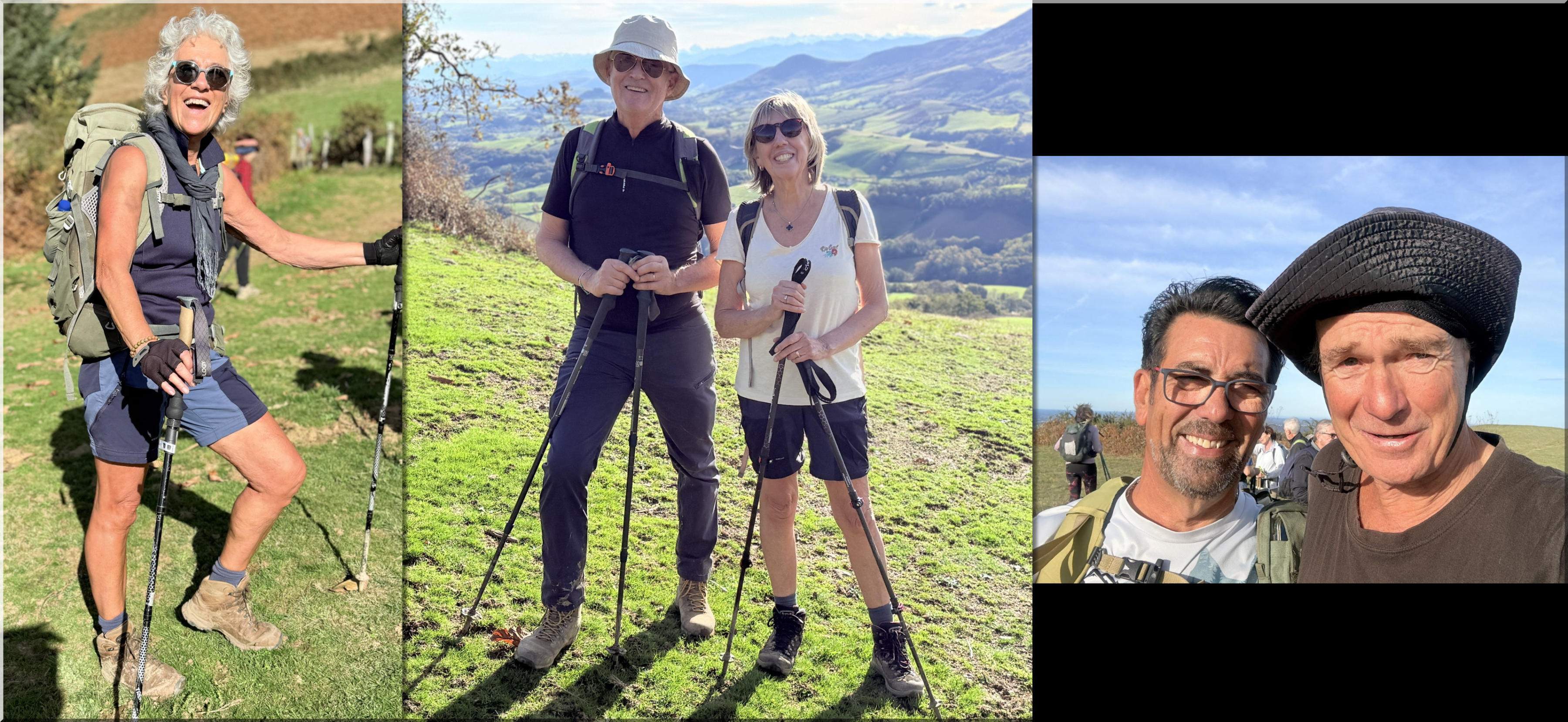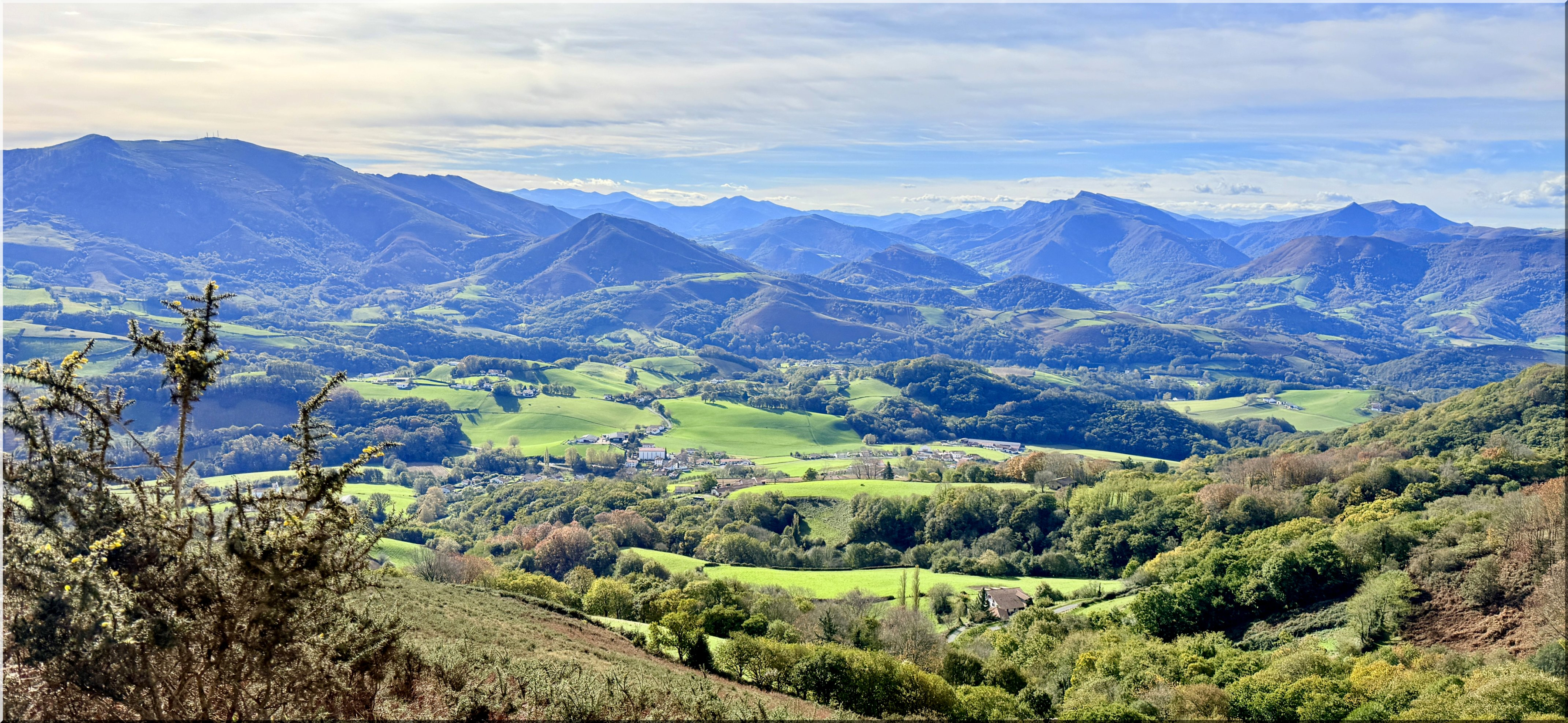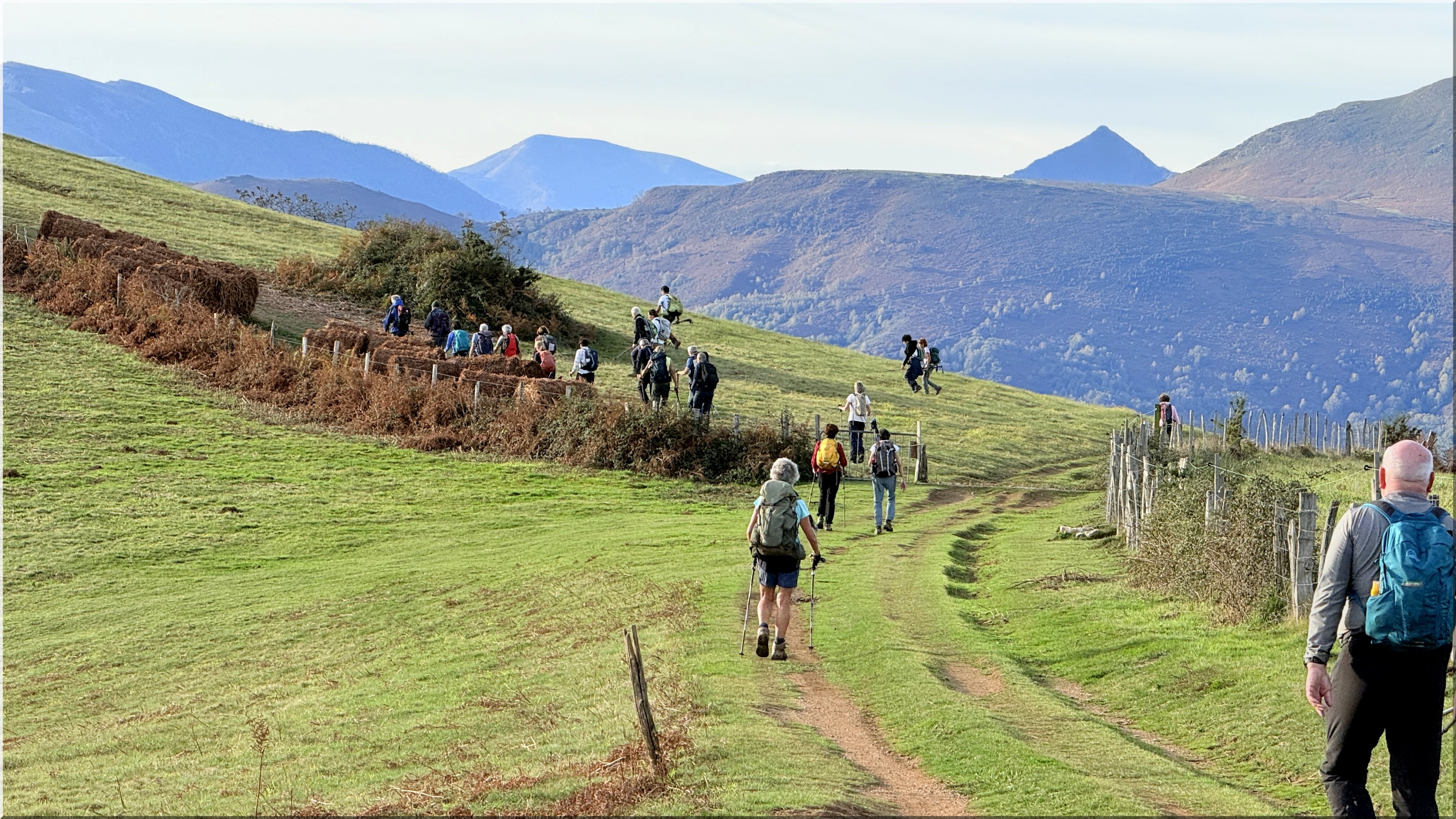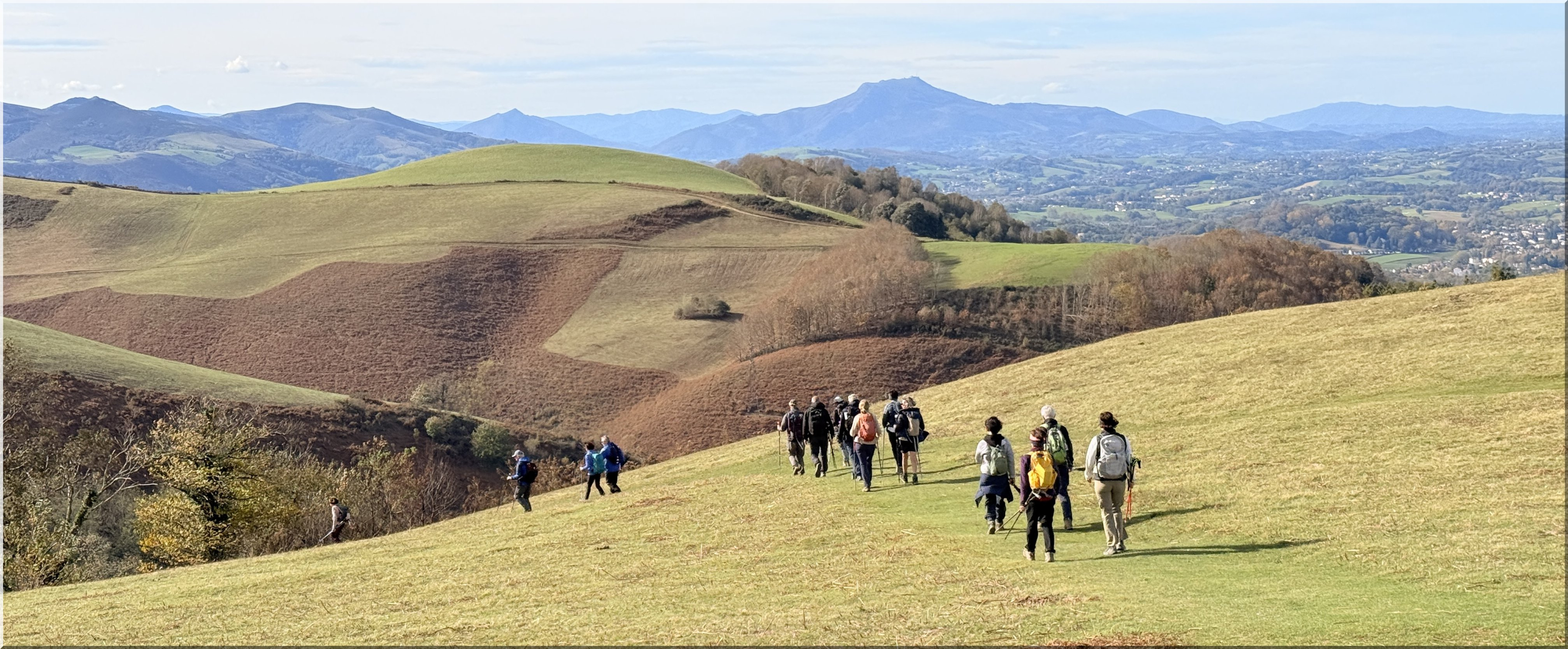 de la rando à 8h30 depuis le parking proche du fronton du village d'Urcuray (altitude 79 m). En préalable, nous saluons le grand retour de Jacques P en tant que guide. Nous suivons ensuite la route direction sud, longeons un ruisseau, passons un portillon métallique en traversant quelques sections très boueuses. Nous commençons à monter, présence de plusieurs captages d'eau, Le chemin poursuit sa pente ascendante dans la vallée et nous entrons dans la forêt. Au-dessus d'une cascade, un sentier prend le relais. La forêt s'éclaircit progressivement et nous cheminons désormais sur la crête herbeuse d'Harrixuri jusqu'au col d'Iramalda (10h05, 397m, courte pause à cet endroit). Au niveau d'une grange, nous tournons à gauche sur une large piste en terre qui monte sur le flanc Ouest de l'Ursuya. Grande douceur des températures, mais le vent du sud forcit à mesure que nous montons. Arrivée au sommet (678m) à 11h40. Le vent ne nous permet pas de pique-niquer confortablement ici, aussi nous descendons jusqu'à l'antenne relais située plus bas, davantage abrités côté nord. Pause pique-nique de 12h00 à 12h25. Nous reprenons notre descente, passons à droite d'une petite barre rocheuse à proximité d'un pylône et arrivons sur une piste jusqu'au point coté 438 (ancienne bergerie, aujourd'hui transformée en demeure habitable). Plus loin un panneau indiquant "Retour Urcuray" nous donne la marche à suivre. Sur la fin du parcours, nous suivons un itinéraire original qui s'écarte du chemin normal. Arrivée aux voitures à 14h00. Emile invite l'ensemble du groupe à partager le verre de l'amitié pour son anniversaire, sur la place du fronton, avec des gâteaux et boissons qu'il a apportés.